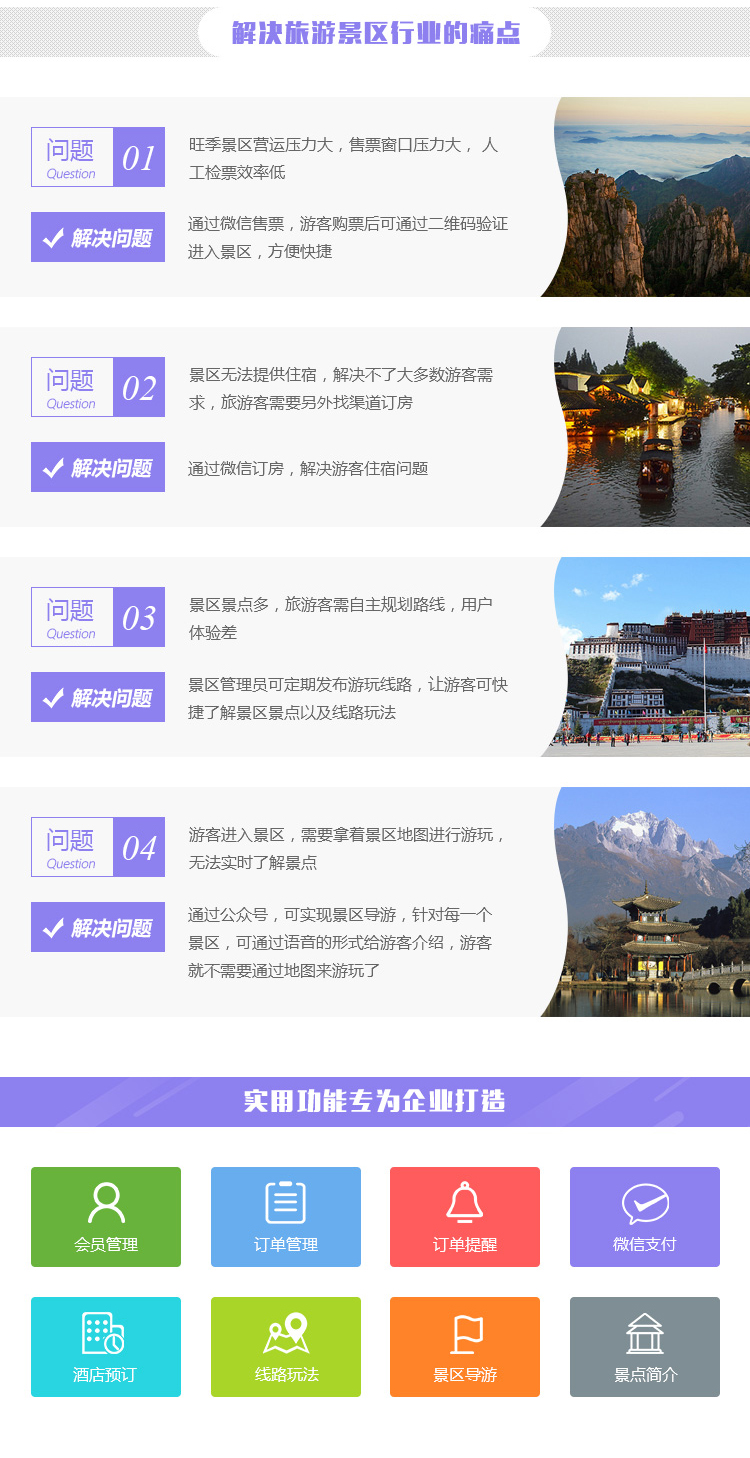 會員管理 訂單管理 訂單提醒 微信支付 酒店預(yù)越 線路玩法 景區(qū)導游 景點介紹