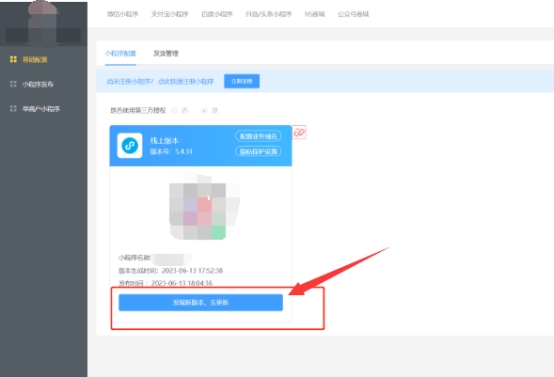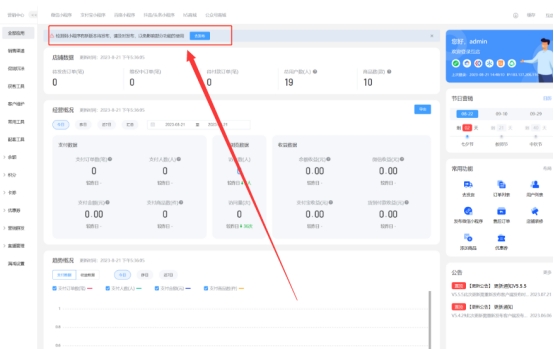 2、進(jìn)入宇淼超級(jí)小程序后臺(tái),點(diǎn)擊【營(yíng)銷中心】,會(huì)看到頂部有更新提示,如下圖,然后按照提示操作即可完成小程序自動(dòng)更新與發(fā)布。