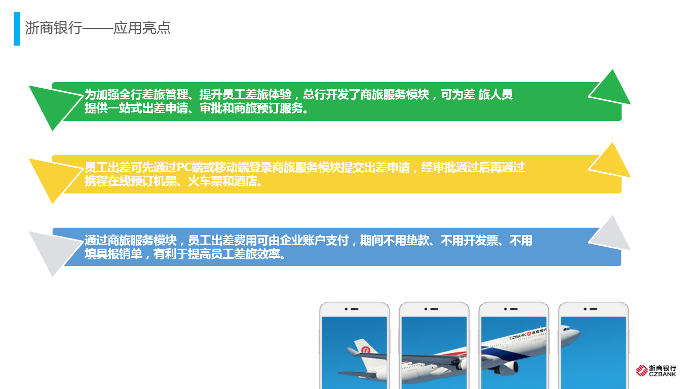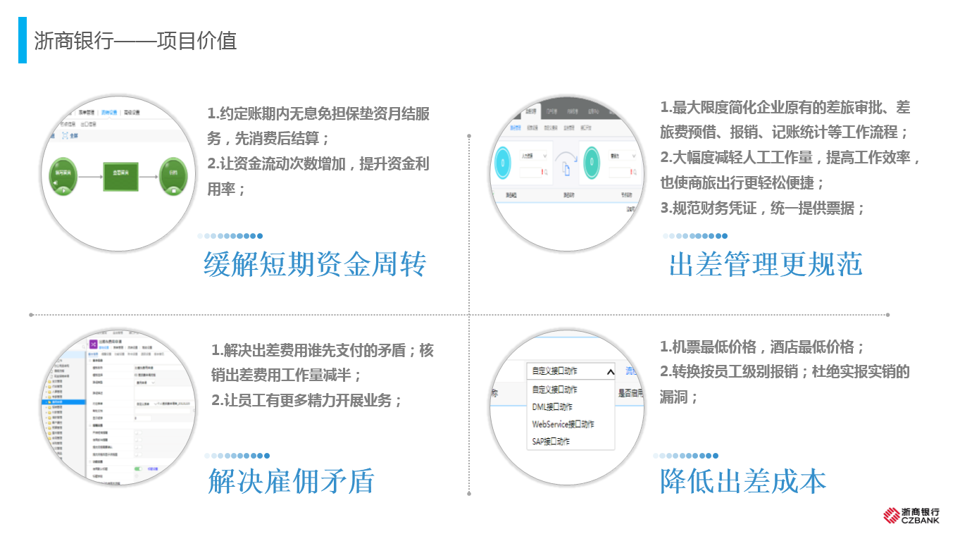 項目價值: 項目實施后,OA協(xié)同辦公平臺為浙商銀行構(gòu)建了一個從執(zhí)行、管控到沉淀的統(tǒng)一協(xié)同平臺,在效益上取得長足的管理改善。并且,泛微為浙商銀行打造的協(xié)同商旅專項應(yīng)用徹底改變了公司原來全員出差管理混亂的舊況。項目上線后的浙商銀行差旅管理服務(wù),進(jìn)行整體規(guī)劃全面執(zhí)行對差旅活動監(jiān)控,優(yōu)化差旅管理流程與制度,在不影響業(yè)務(wù)開展和出行體驗的前提下,降低差旅成本并提高出行效率。