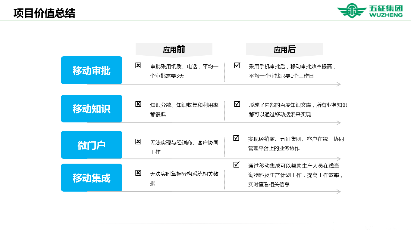 項目價值: 1、五征集團OA項目實施上線后,使用總?cè)藬?shù)超過10000,平均每日PC端在線人數(shù)超過800,每天產(chǎn)生500條以上的流程,總計約提升工作效率300%以上,大大改善了集團內(nèi)部的工作,實現(xiàn)公司高效協(xié)同辦公。 2、OA協(xié)同辦公平臺搭建了移動微門戶,打通企業(yè)內(nèi)外網(wǎng),滿足客戶“隨時”購車需求。移動微門戶實現(xiàn)統(tǒng)一入口,統(tǒng)一信息發(fā)布,產(chǎn)品展示,在線訂單管理,經(jīng)銷商管理以及微信、微博管理。 3、通過OA與DMS系統(tǒng)集成,實現(xiàn)業(yè)務(wù)人員移動化的客戶管理;系統(tǒng)建立任務(wù)監(jiān)督與日常執(zhí)行的應(yīng)用閉環(huán),實現(xiàn)任務(wù)與日程管理; 4、項目實現(xiàn)了多層級分權(quán)的門戶管理,建立了個人門戶、集團門戶、各大職能門戶以及專題門戶;