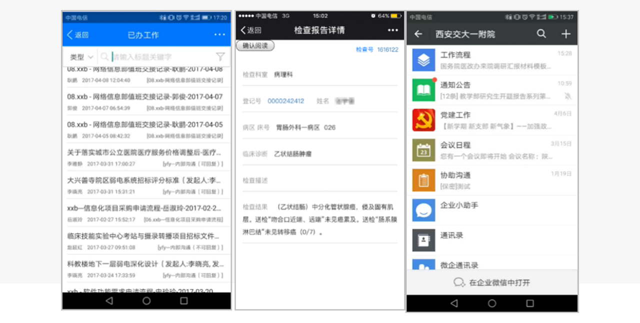 ▊公司介紹: 西安交通大學(xué)第一附屬醫(yī)院于1956年建院,是國(guó)家衛(wèi)生計(jì)生委委管大型綜合性三級(jí)甲等醫(yī)院,是全國(guó)首批暨陜西省首家“三級(jí)甲等醫(yī)院”、全國(guó)首批“百佳醫(yī)院”, 目前在職職工4400余人,開(kāi)放床位2560張;2016年服務(wù)門急診患者241萬(wàn)、住院患者11.8萬(wàn) 按照“兩院四區(qū)”的戰(zhàn)略布局,目前已經(jīng)全面托管了陜西省彬縣中醫(yī)醫(yī)院、韓城民楊醫(yī)院等基層醫(yī)院,并全力推進(jìn)國(guó)際陸港醫(yī)院、興善寺分院、延安新區(qū)醫(yī)院等合作項(xiàng)目。 ▊項(xiàng)目需求: 1、將HIS系統(tǒng)等業(yè)務(wù)數(shù)據(jù)集成到 宇淼 OA頁(yè)面中集中展現(xiàn),如醫(yī)院門診、護(hù)理等業(yè)務(wù)信息,方便院內(nèi)領(lǐng)導(dǎo)、職工實(shí)時(shí)查看; 2、管理信息化,醫(yī)院行政辦公流程電子化、信息化,利用軟件系統(tǒng)輔助醫(yī)院日常管理,減輕醫(yī)院職工處理日常事物工作強(qiáng)度; 3、滿足醫(yī)院移動(dòng)化辦公的需求,提高業(yè)務(wù)、辦公事務(wù)處理效率 ▊項(xiàng)目建設(shè)內(nèi)容: 1、將醫(yī)院HIS系統(tǒng)數(shù)據(jù)集成到OA中,并形成報(bào)表門戶頁(yè)面,同時(shí)支持在PC端、移動(dòng)端訪問(wèn),便于院內(nèi)領(lǐng)導(dǎo)、職工時(shí)刻掌握醫(yī)院各項(xiàng)院務(wù)信息;實(shí)現(xiàn)單點(diǎn)登錄,便捷日常使用。 2、流程管理應(yīng)用:完成了醫(yī)院內(nèi)從行政辦公到醫(yī)院日常業(yè)務(wù),所有板塊合計(jì)200多條流程的電子化,包含門診、護(hù)理、采購(gòu)乃至醫(yī)風(fēng)醫(yī)德建設(shè)等所有流程,還可通過(guò)可視化流程圖對(duì)流程進(jìn)度進(jìn)行追蹤,只需通過(guò)后端引擎配置實(shí)現(xiàn),不需要開(kāi)發(fā)。同時(shí)也支持集團(tuán)化分級(jí)分權(quán)管理和移動(dòng)端應(yīng)用。 3、提供移動(dòng)端App 和微信應(yīng)用,通過(guò)手機(jī)即可完成: ①醫(yī)生查房:查看患者各項(xiàng)信息、危急值,隨時(shí)隨地掌控患者的病情,及時(shí)根據(jù)患者病情對(duì)患者治療方案進(jìn)行調(diào)整; ②流程查看、處理 選擇 工作流程--選中流程--辦理流程--選擇人員轉(zhuǎn)發(fā)--提交完成 ③醫(yī)院公文、通知公告提醒;組織成員即時(shí)通訊、群組會(huì)話等 ▊項(xiàng)目?jī)r(jià)值: 1、醫(yī)院HIS系統(tǒng)數(shù)據(jù)集成,發(fā)布到報(bào)表門戶頁(yè)面集中展現(xiàn),并支持PC端和移動(dòng)端同步查看,方便院領(lǐng)導(dǎo)、職工時(shí)刻掌握醫(yī)院的業(yè)務(wù)運(yùn)營(yíng)狀態(tài); 2、實(shí)現(xiàn)了院內(nèi)流程的全面電子化,涵蓋醫(yī)院所有業(yè)務(wù)板塊、合計(jì)200多條流程。系統(tǒng)部署半年后,流程流轉(zhuǎn)總數(shù):9萬(wàn)余條,其中已辦率98.29%。提高辦事效率的同時(shí),也促進(jìn)了醫(yī)院各部的規(guī)范化管理; 3、移動(dòng)端App、微信應(yīng)用,全院全業(yè)務(wù)支持移動(dòng)化管理,隨時(shí)隨地處理醫(yī)院事務(wù),大大提升全院溝通效率;平臺(tái)賬號(hào)5335個(gè),總登錄人次70萬(wàn)余人次,移動(dòng)辦公登錄超過(guò)四分之一; 4、為醫(yī)院構(gòu)建的統(tǒng)一知識(shí)管理平臺(tái),半年內(nèi): · 文檔創(chuàng)建總數(shù):92000多條 · 文檔下載次數(shù):27萬(wàn)余條 · 完成網(wǎng)上調(diào)查:7百余條